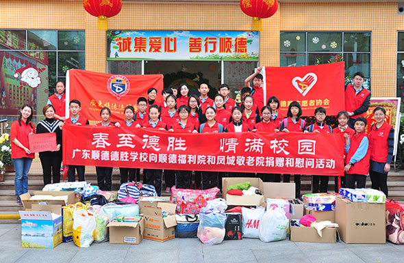 在这春暖花开的雷锋月里,广东顺德德胜学校志愿者协会的师生近40人先后走进顺德区儿童福利院及大良颐年苑,探望孤儿和长者,为他们送上全校师生捐赠的生活用品,并为他们表演了精彩的文艺节目,共度了短暂而愉快的时光。